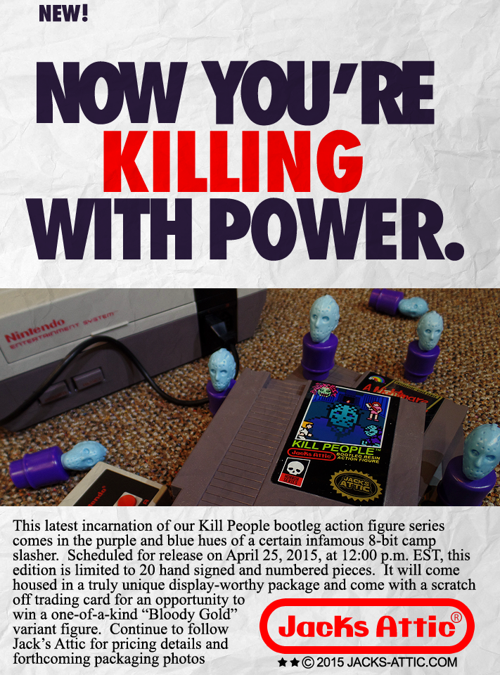 Get the Power! Killing Power! 4/25/15 Posted byJackApril 13, 2015April 13, 2015Posted inAction Figures/Toys, Video GamesTags:action figure, Action Figures, art toy, bootleg, Bootleg Figure, Fisher Price, Friday the 13th, Jacks Attic, Jason, Jason Voorhees, Kill People, NES, Nintendo, Resin, Resin Action Figure, Resin Figure, Resin Toy, Video Game, Video Games Share this: Click to share on Facebook (Opens in new window) Facebook Click to share on X (Opens in new window) X Click to share on Reddit (Opens in new window) Reddit Click to print (Opens in new window) Print Click to share on Pinterest (Opens in new window) Pinterest Like Loading... Related Published by Jack Graphic designer fixated on retro video games, horror movies, trading cards, bootleg action figures and professional wrestling. View more posts