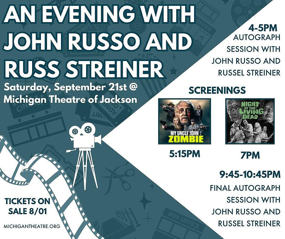 An Evening With John Russo and Russ Streiner Share this: Click to share on Facebook (Opens in new window) Facebook Click to share on X (Opens in new window) X Click to share on Reddit (Opens in new window) Reddit Click to print (Opens in new window) Print Click to share on Pinterest (Opens in new window) Pinterest Like Loading...